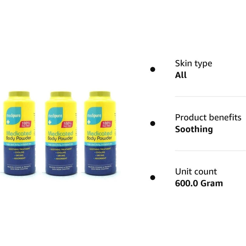 Each pack contains 3 bottles of 200g Medipure Medicated Body Powder, making it a great value for your money. This astringent substance is gentle on the skin and is suitable for all skin types. Say goodbye to talc and hello to a healthier, happier you with Medipure Medicated Body Powder.