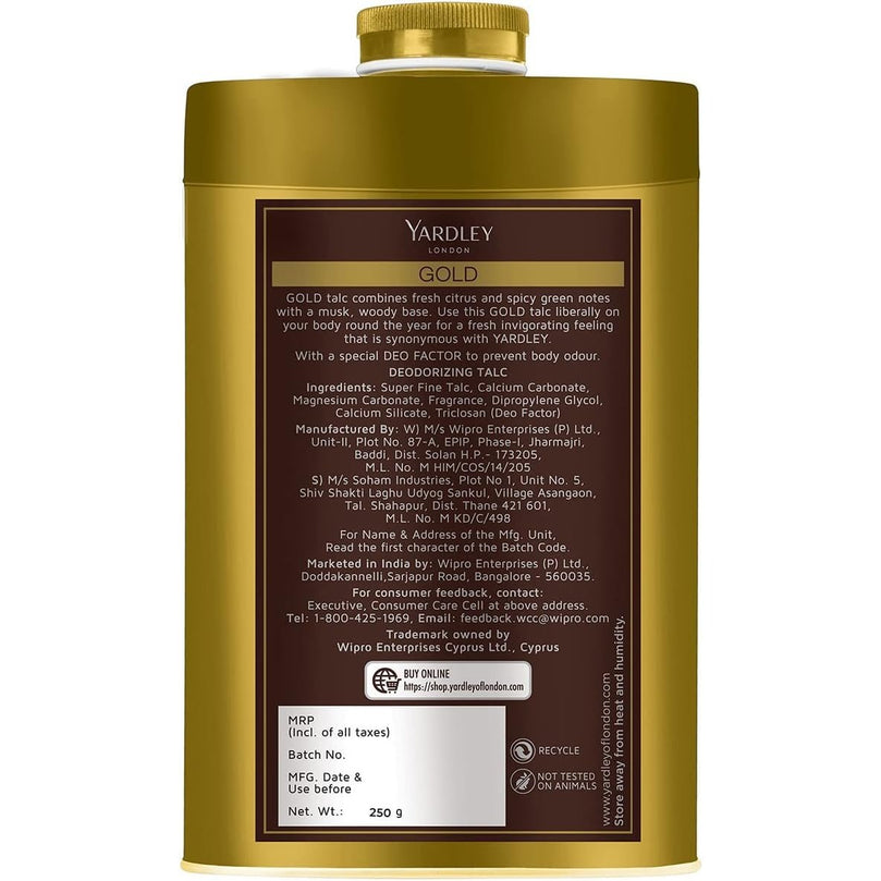 Indulge in the luxurious and refreshing scent of Yardley London Gold Talcum Powder. This 250g powder is perfect for everyday use, leaving your skin feeling soft and fragrant all day long. The contemporary and elegant packaging adds a touch of sophistication to your daily routine.