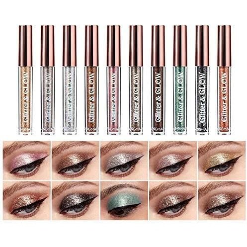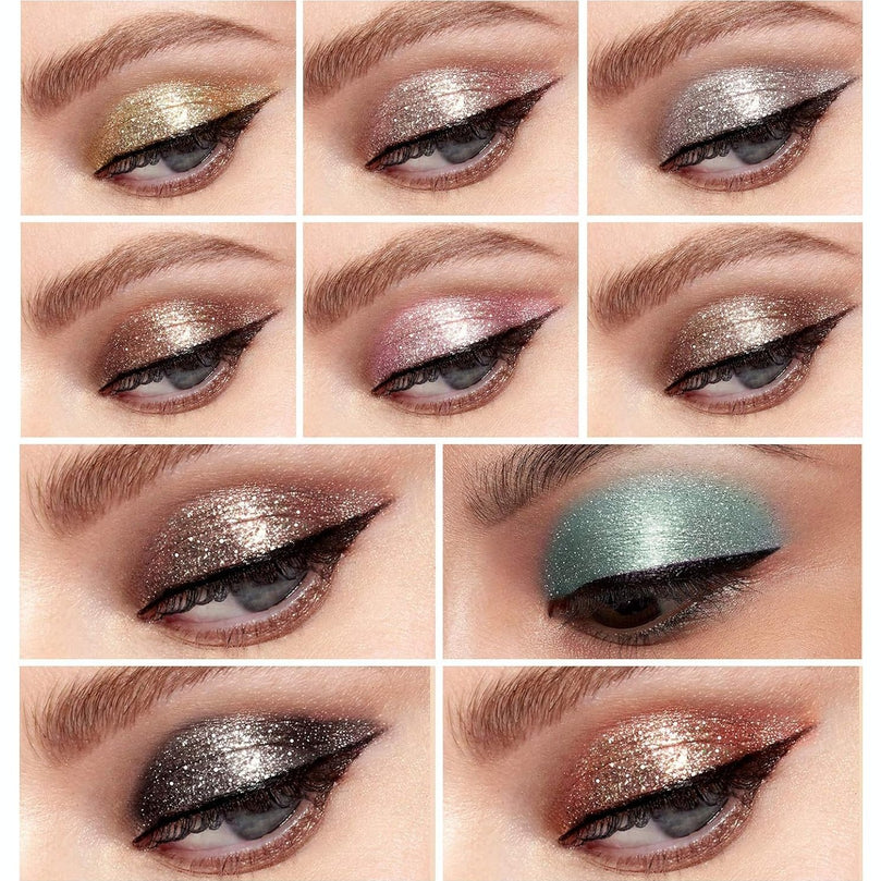 Our Liquid Eyeshadow Set comes with 10 shades, each packing a punch with high-pigmentation. You`ve got smooth mattes in light green and ochres, alongside soft sandy nude-tones that all boast extended wear. To top it off, Not forgetting the pure gold metallic glitter for those daring, bold eye looks.we`ve got pressed shimmers and pearls in bronze and rose hues that give you a shimmery eye finish.