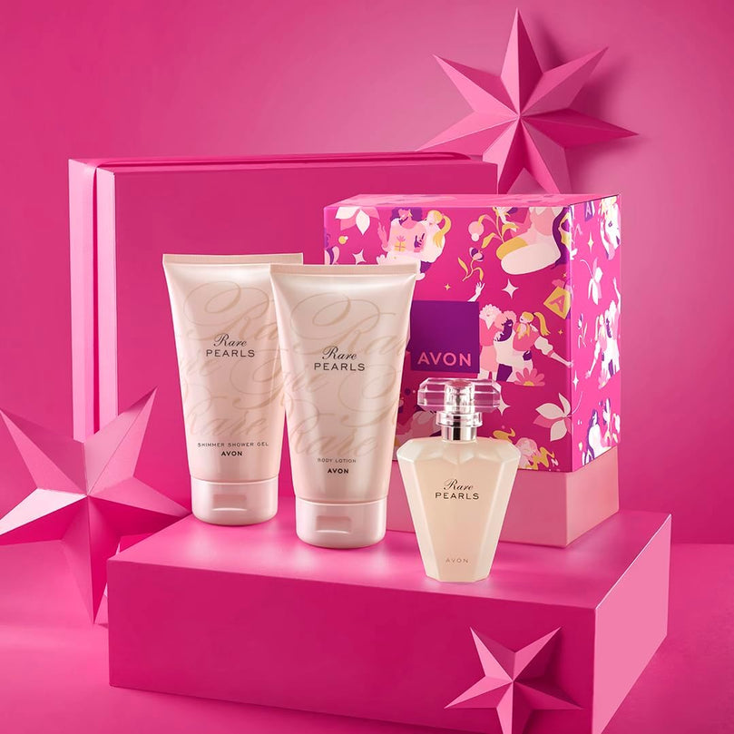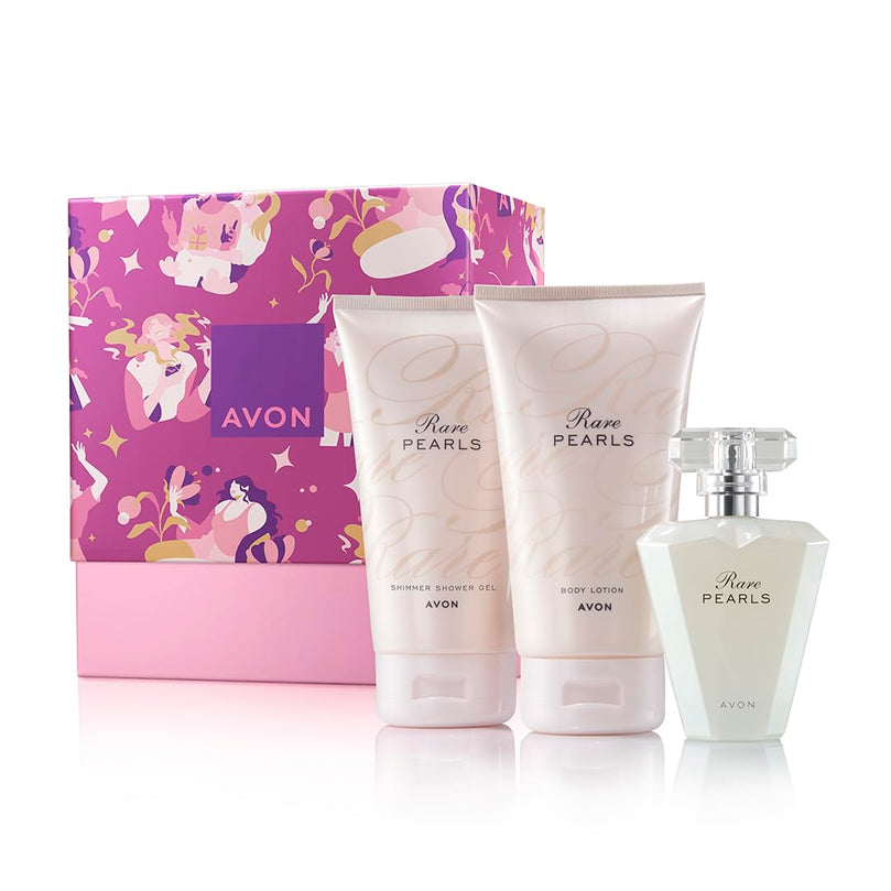 Treat yourself or a special woman in your life to the captivating scent of Avon Rare Pearls with this stunning three piece gift set. It includes: