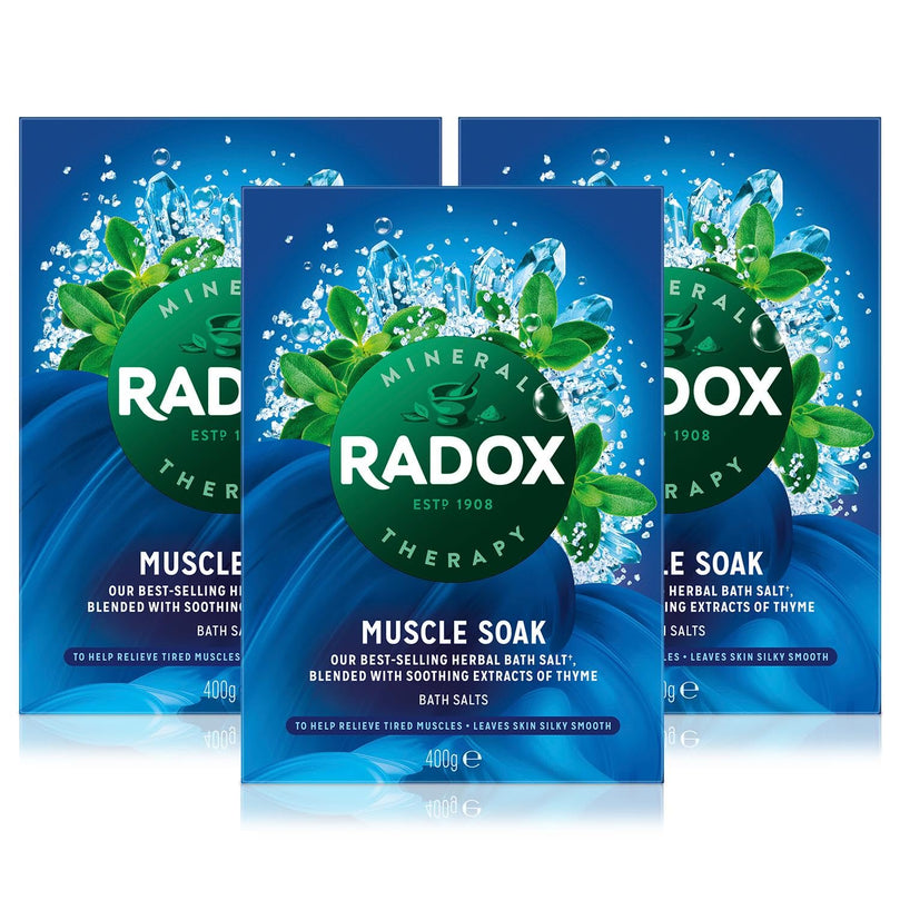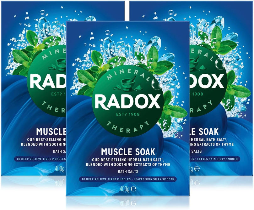 Indulge in a luxurious bath experience with Radox Muscle Soak Bath Therapy Thyme Scented Herbal Bath Salt. This multi-pack contains 3 400g packs of expertly blended herbs and minerals to soothe and soak your tired and aching muscles.