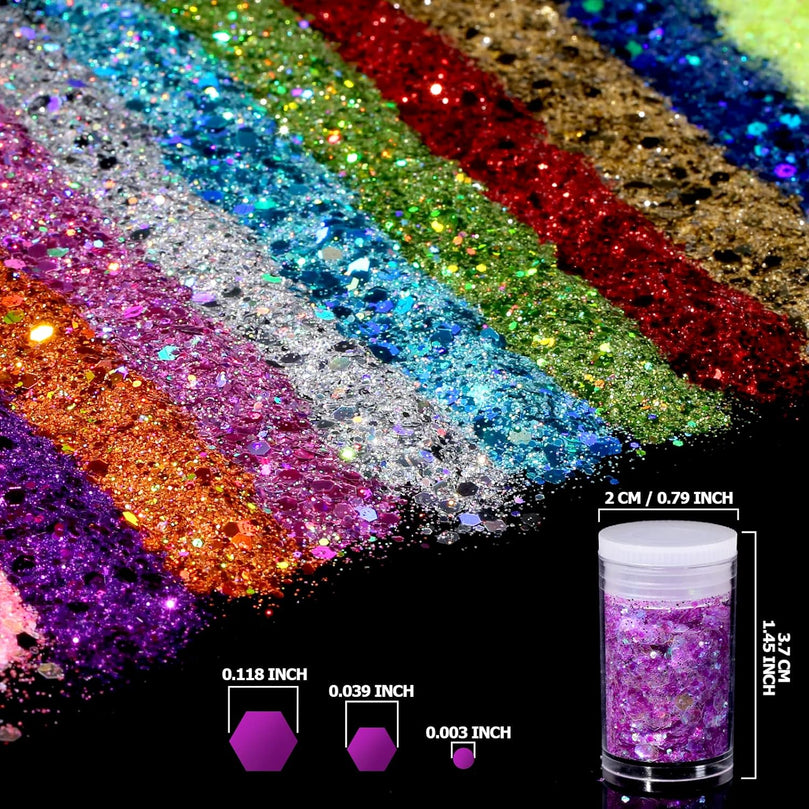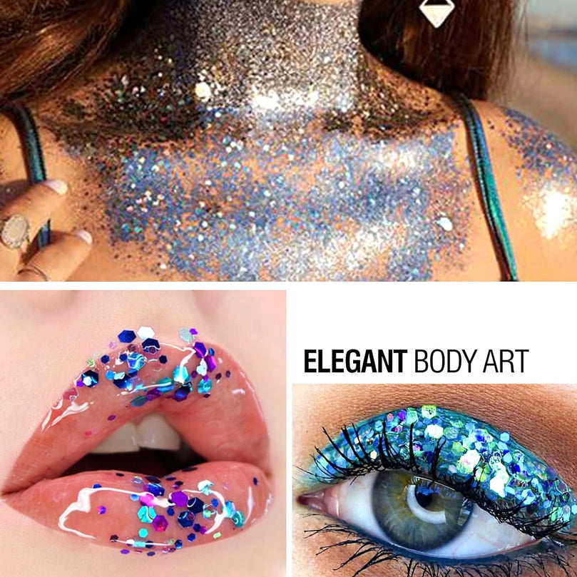 Mixed Size Iridescent Body Glitter - Each color come with 3 different sizes, 0.003inch(round shape), 0.039inch & 0.118inch(hexagon shape), easily help create multiple-layered body glitter decoration, you can use it to decorate your cheek, eyes, arms, neck, lip or nails, adding charming element for you to catch people’s eyes in party