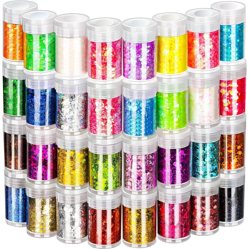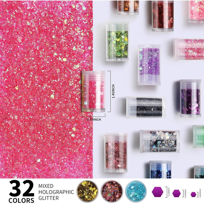 32 Colors Bulk Chunky Glitter - Each Pot is 7-8g, full set include Gold, Green, Grass Green, Fluorescence Green, Silver, Holographic White, Iridescent Silver, Copper Red, Red, Iridescent Purplish, Holographic Rose, Hot Pink, Light Pink, White, Brown, Purplish Pink, Purple, Iridescent Violet, Iridescent Purple, Holographic Purple, Iridescent Gold, Iridescent Black, Blue, Iridescent Blue, Holographic Blue, Peacock Blue, Sky Blue, Champagne Gold, Yellow, Iridescent Green, Orange, Holographic Pink