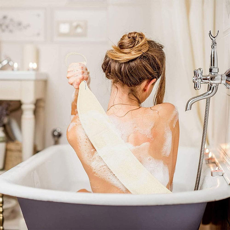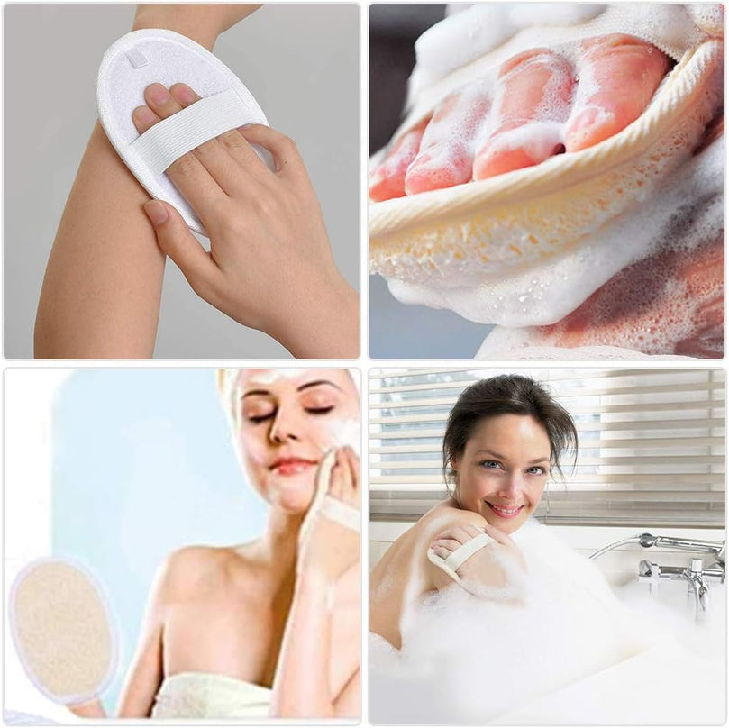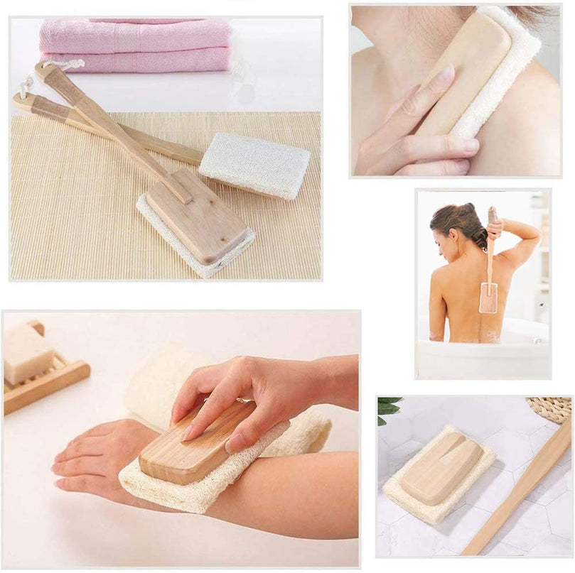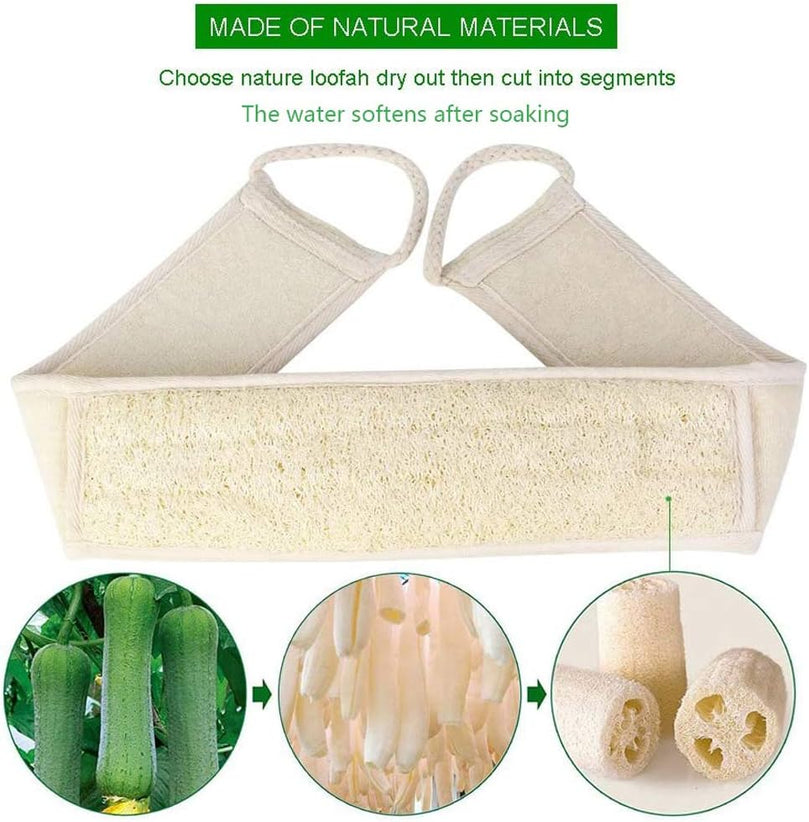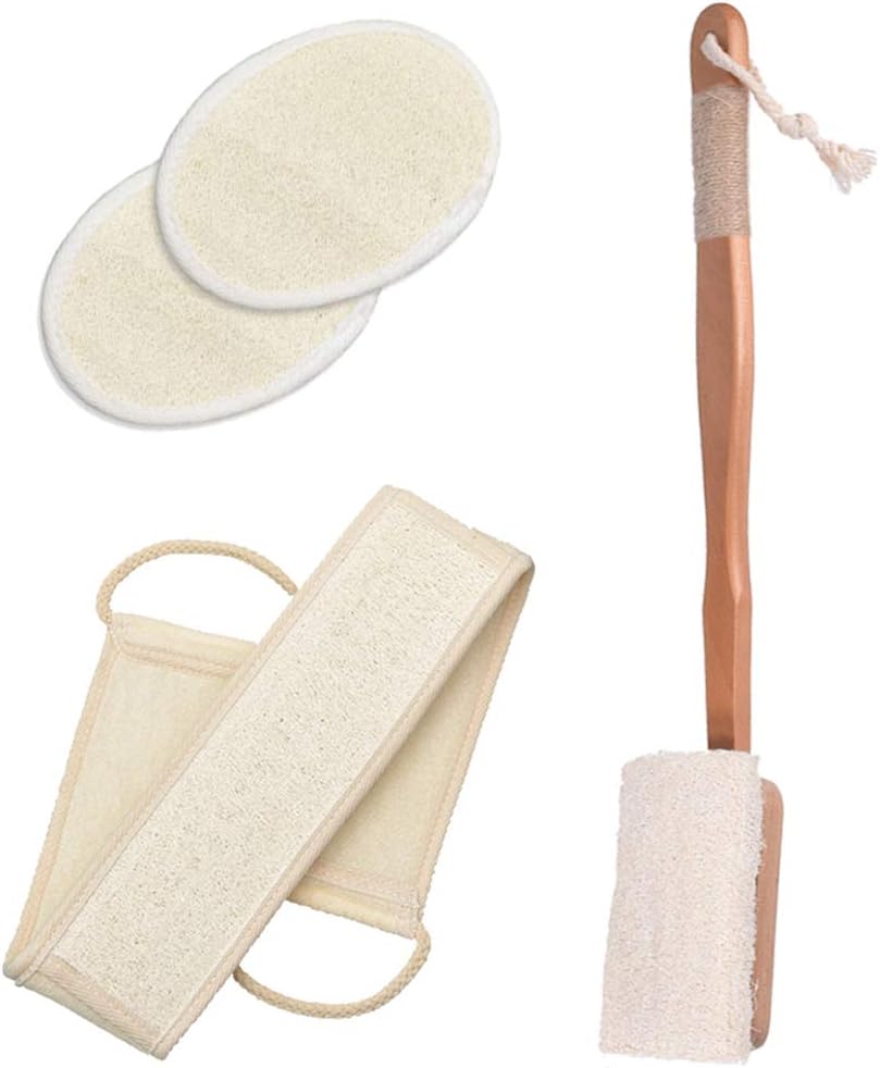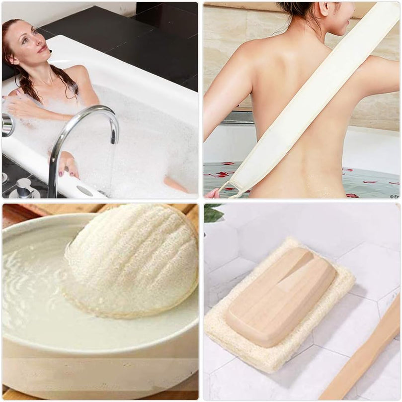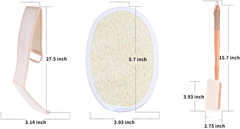 Our 4-piece set includes 2 loofah pads, 1 long back scrubber, and 1 long handle towel gourd brush. Elevate your self-care routine with our Loofah Exfoliating Back Scrubber Set.