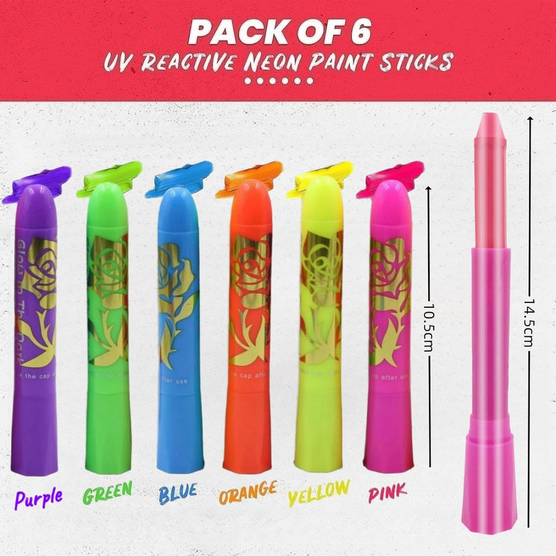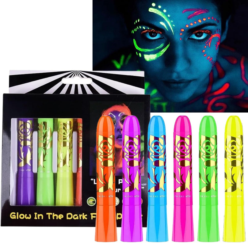 【Package Content】You will receive 6 pcs face paint sticks including 6 colours (pink, yellow, blue, green, orange, purple). The face paints for adults are enough to meet your different make-up needs. The glow in the dark face paint can glow under UV light or black light.