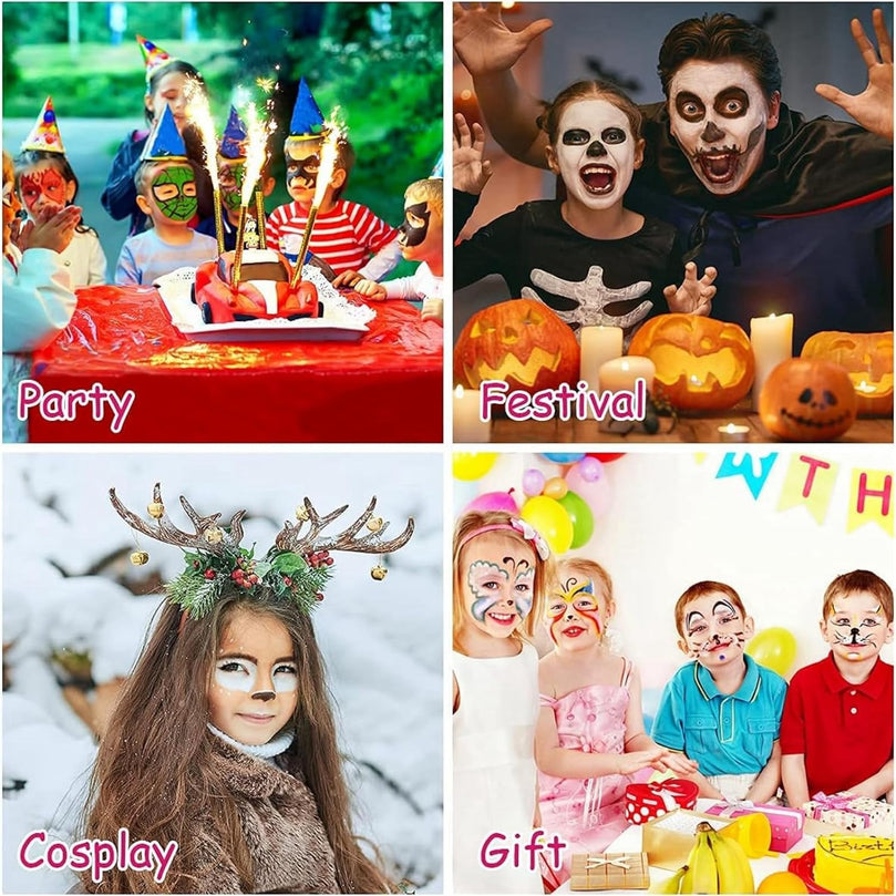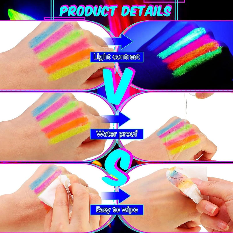 【Easy to Clean】The glowing face paints can be cleaned with water. Or add some toiletries so that uv paint face is easier to clean. Don't worry about leaving body paints on your face. Kids can also use face painting kit without worry.
