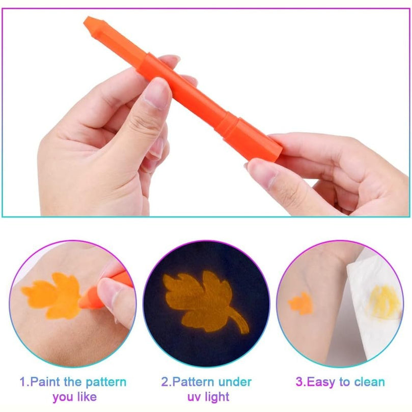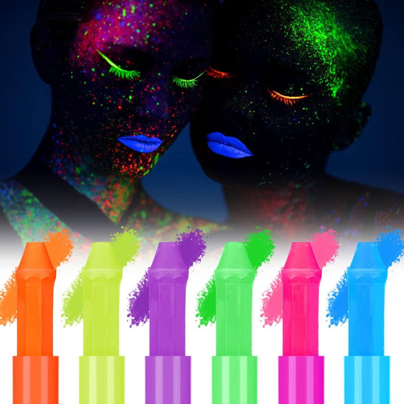 【UV GLOW NEON FACE PAINTING】Our set includes 6 neon glow crayons in different colors, use our easy-to-use body crayons to create fun designs or intricate works of art to create your unique look. This neon paint will make you stand out and is an essential gadget for every party game session.
