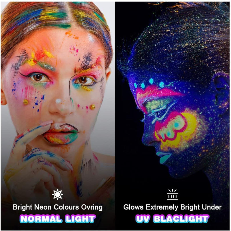 【AMAZING GLOW EFFECT】After you paint different colors on your face or body, it will appear bright neon color under natural light, and emit amazing fluorescence under UV light or black light light, which is an incomparable Beautiful and fun, it's the pinnacle of your night party style!