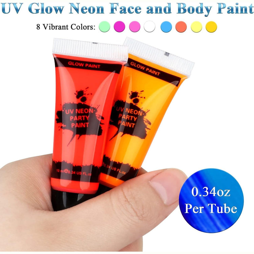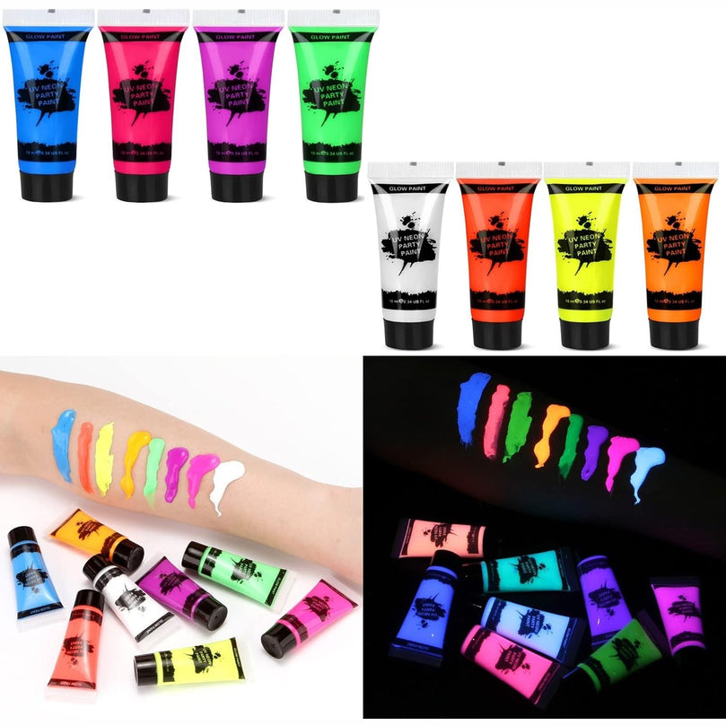Glows Brightly under UV Light: This neon paint can glow brightly under UV light at night, there are eight different colors, with brushes and palettes, you can DIY the patterns you want, stand out from the crowd, and be the brightest person in the party. It's also a good choice for Halloween.