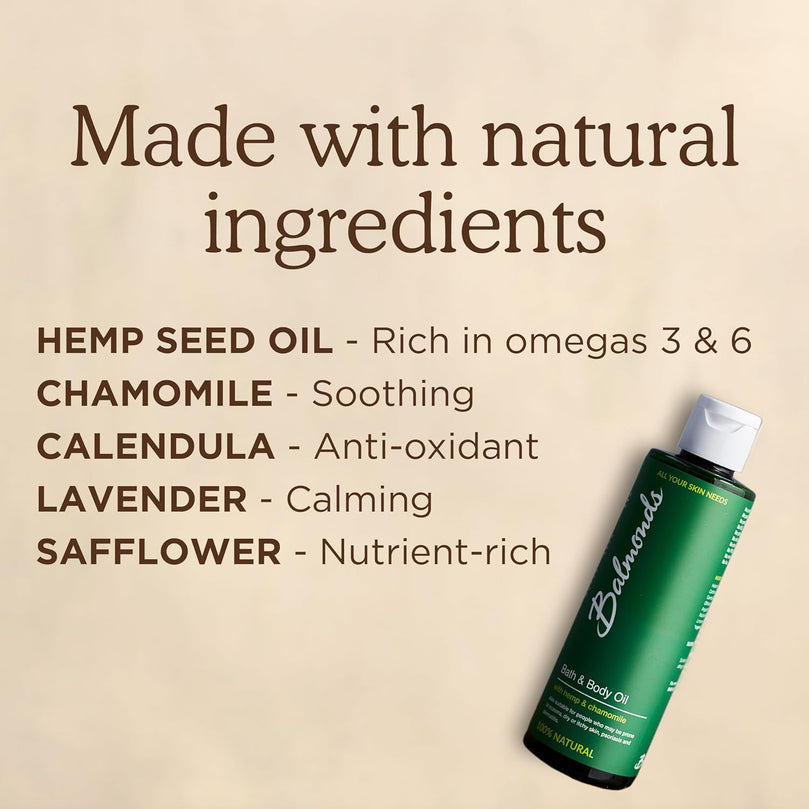 Introducing Balmonds Bath & Body Oil, a versatile and nourishing body oil that is perfect for all ages and skin types. Made from a unique blend of plant-based oils, including hemp, olive, and chamomile, this 100% natural body oil is free from synthetic perfumes and petrochemicals, making it safe for use on babies and children.