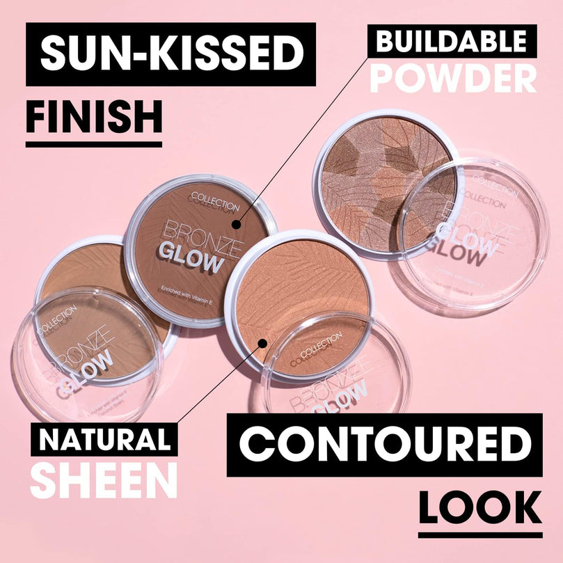 Achieve a natural bronzed look with Collection’s Bronze Glow range. This highly pigmented bronzer is perfect for both fair and darker skin tones, providing a rich and deep color payoff. Its deep pigmentation allows for easy contouring and adds a radiant glow to your complexion.