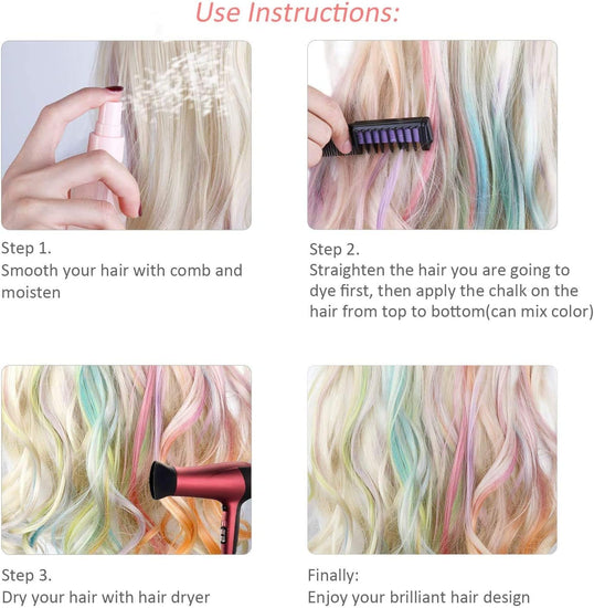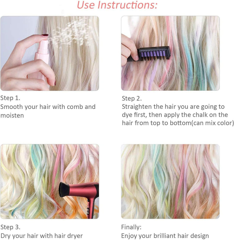 Easy to use: These washable hair chalks are simple to apply - just dampen your hair, add color where desired, and quickly set it with a hair dryer. The color stays vibrant and can be easily removed after use.
