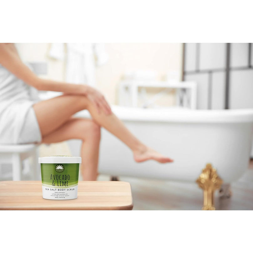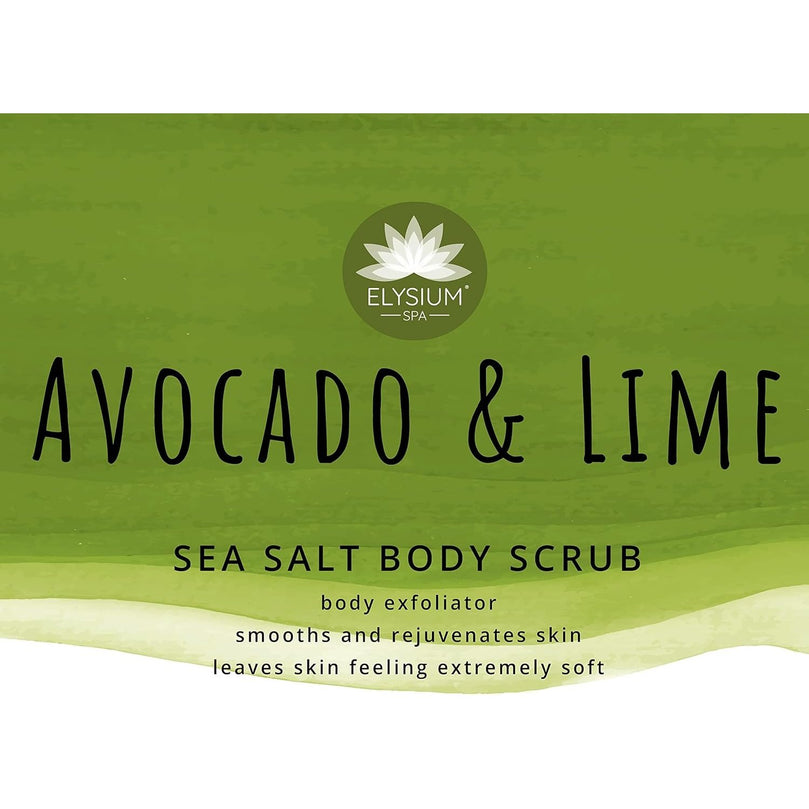 DEEP CLEANSING: Elysium Spa Sea Salt Body Exfoliator enriched with Avocado & Lime, contains natural exfoliants to gently polish the skin removing dead skin cells for a deep soothing cleanse