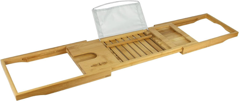Extendable Bamboo Bath Caddy & Tray | Adjustable Luxury Home Spa Wood Bath Tub Rest | Wine Glass, Tablet / Book, Smartphone Holder Bridge | Non-Slip Feet | M&W