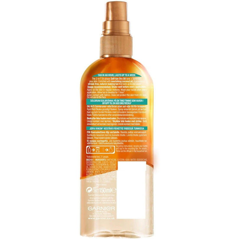 Experience a streak-free, beautiful tan that lasts up to 1 week with Garnier Ambre Solaire Natural Bronzer Self Tan Dry Oil. Enriched with nourishing coconut oil, this 2-in-1 oil not only provides a radiant tan but also deeply nourishes and leaves your skin soft and supple.