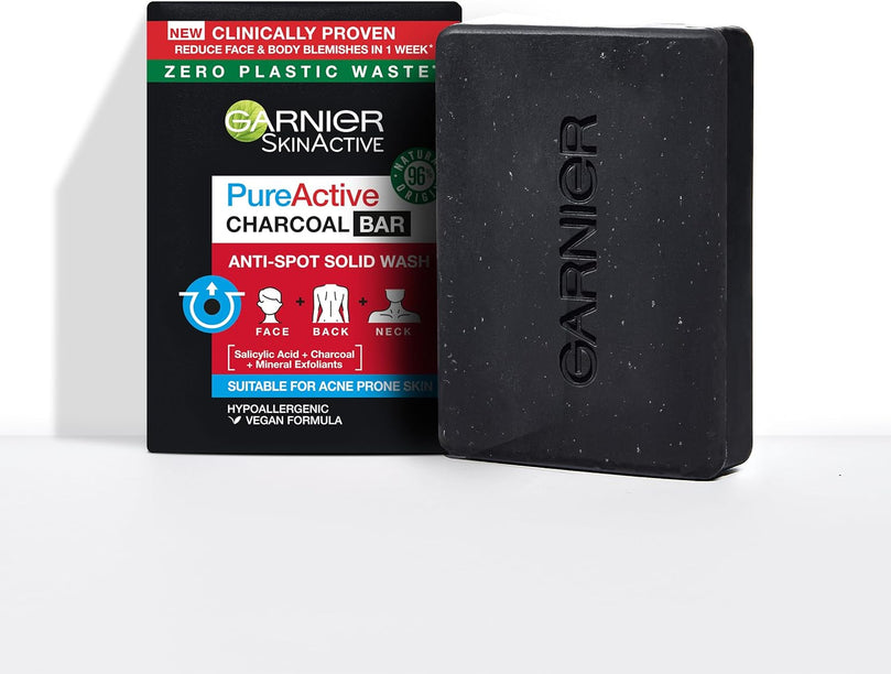 The Garnier Pure Active Charcoal Bar is a powerful cleansing bar that is designed to reduce face and body blemishes in just one week. Its unique formula combines the detoxifying properties of charcoal with the acne-fighting ingredient salicylic acid to deeply cleanse the skin and prevent the appearance of spots and other skin concerns.