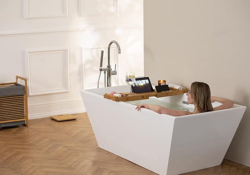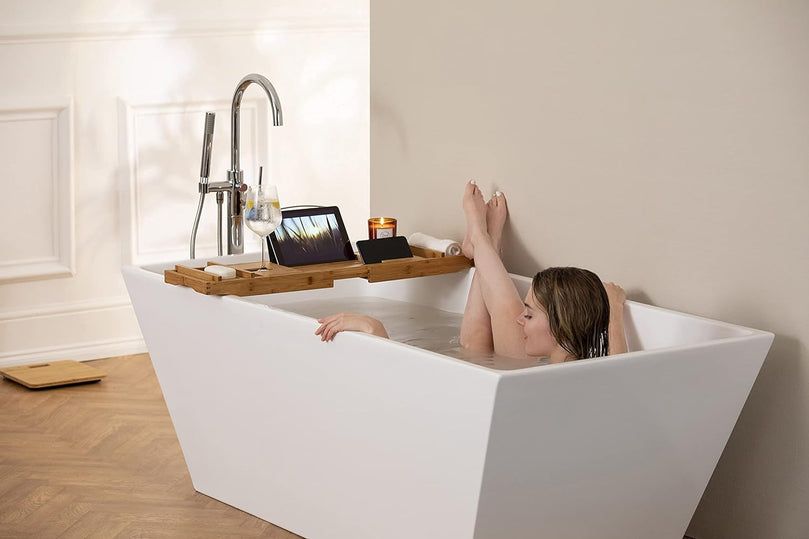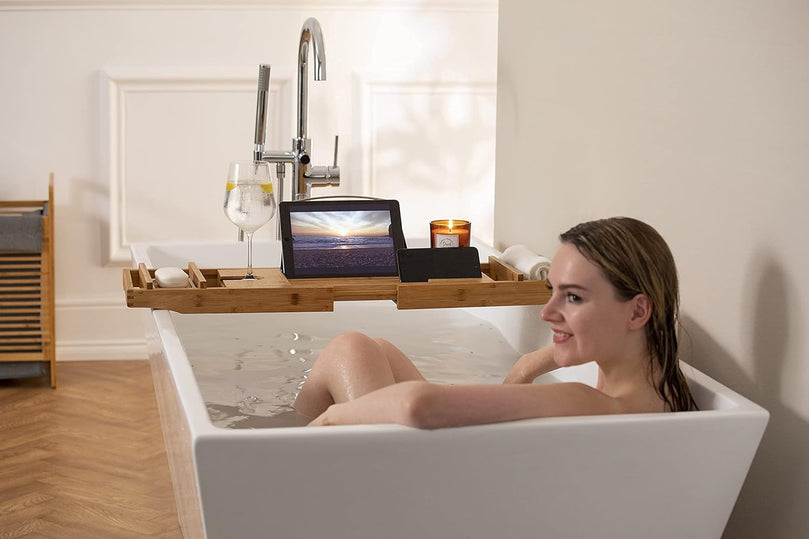 Transform your bath into a haven of relaxation with the Homiu Bamboo Bath Caddy. This innovative caddy is designed to enhance your bath time experience by providing a convenient and stylish way to hold your favorite items. Whether it's a glass of wine, candles, snacks, a good book, or your tablet, this caddy has got you covered.