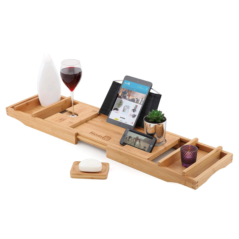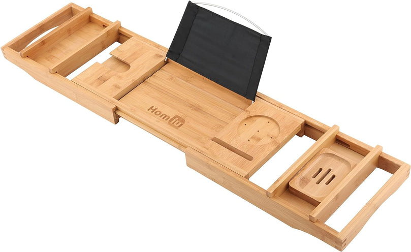 Homiu Bamboo Bath Caddy | Extendable | 100% Natural Bamboo Wooden Bathtub Tray with Book & Tablet Stand | Luxury Wine Glass Candle Holder | Natural Wood | Extending Organiser for Bathroom Jacuzzi