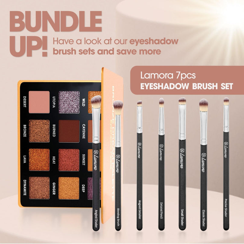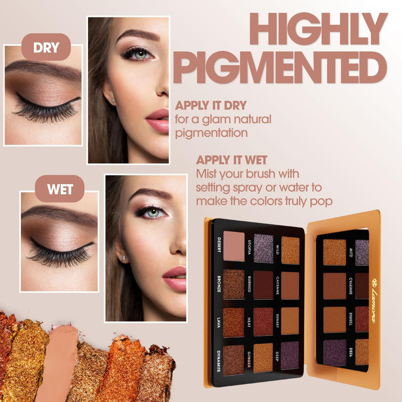 Add depth and life to your skin with Lamora's warm bronze nude eyeshadow palette. This versatile palette features 12 highly pigmented shades in both shimmer and matte finishes, perfect for creating a variety of natural and glam looks.