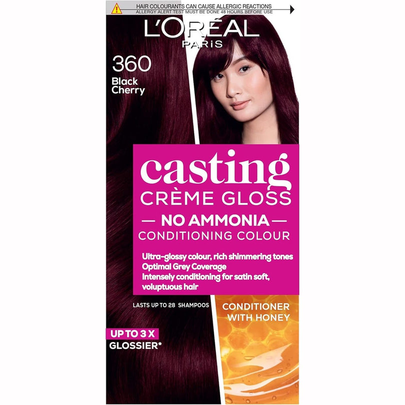 Contents: 1x L'Oréal Paris Casting Crème home hair colour sets in 360 Black Cherry, The box includes: 1x caring colourant crème, 1x developer crème, 1x conditioner, 1x pair of protective gloves