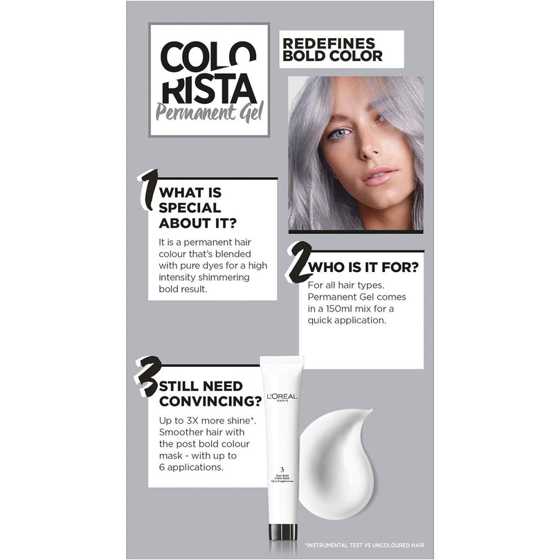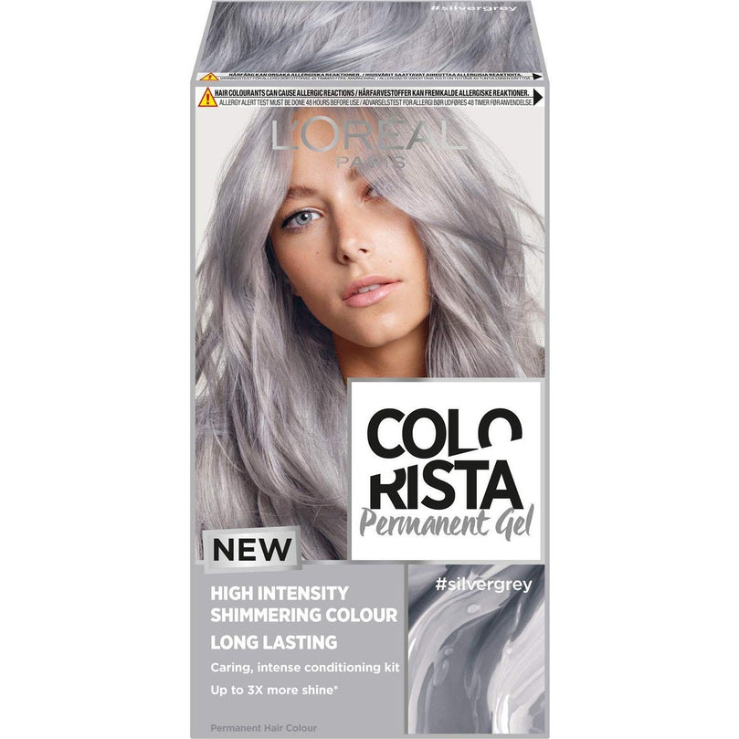 Contents: 1x L'Oréal Paris Colorista Permanent Gel Hair Dye in Silver Grey, Box includes: 1x Colouring Gel, 1x Developer Cream, 1x Post Bold Colour Mask, 1x pair of protective gloves, 1x user guide