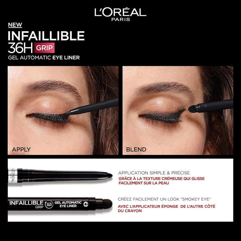 Contents: 1x L'Oréal Paris Infallible Grip 36H Gel Automatic Eyeliner, Semi Permanent, With Smudger and Sharpener, Colour: Intense Black