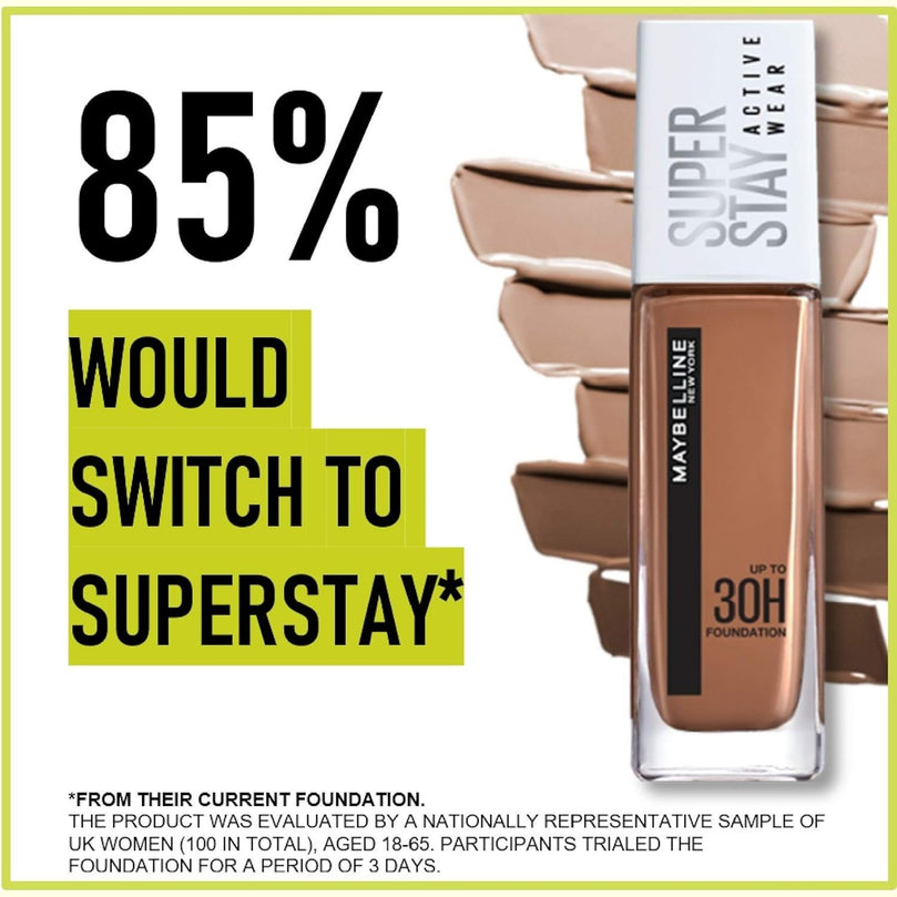 Elevate your makeup game with the Maybelline New York Superstay Active Wear 30 Hour Long-Lasting Liquid Foundation. Experience full coverage that lasts all day, with a lightweight feel and a natural satiny, matte finish. Whether you're facing water, sweat, or transfer, this foundation stays in place. Say goodbye to imperfections as it evens out your skin for a flawless look. Its oil-free and non-comedogenic formula makes it suitable for all skin types, and the ample 30 ml of product ensures you have plenty to achieve your desired look. Don't settle for anything less than flawless with this amazing foundation.