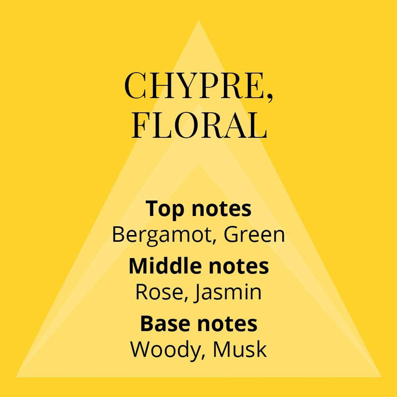 - Vibrant bergamot and green notes lift a floral heart of rose, jasmine, geranium and mild chamomile