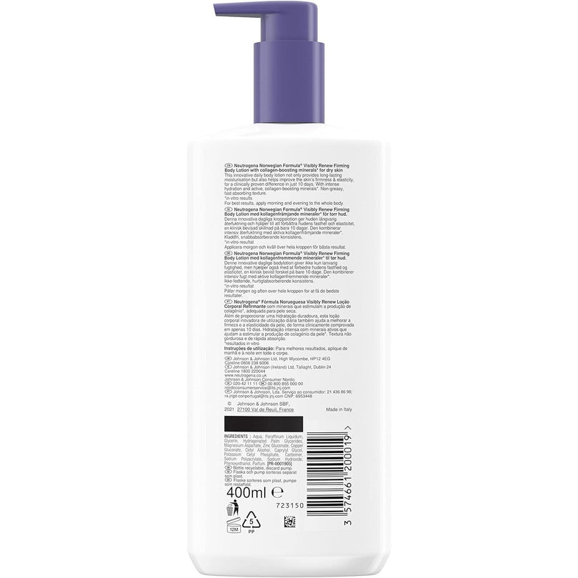 Experience the power of Norwegian Formula with our innovative Visibly Renew Elasti-Boost Body Lotion. This 400ml bottle is packed with Aloe Vera and active minerals to help improve skin's suppleness and elasticity in just 10 days. Say goodbye to dry, dull skin and hello to a firmer, more radiant you.