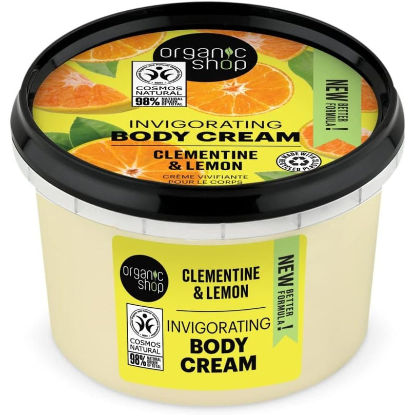 Experience the invigorating and nourishing benefits of the Organic Shop Invigorating Body Cream Clementine and Lemon (250ml). Treat your skin to the best with this organic and refreshing body cream.