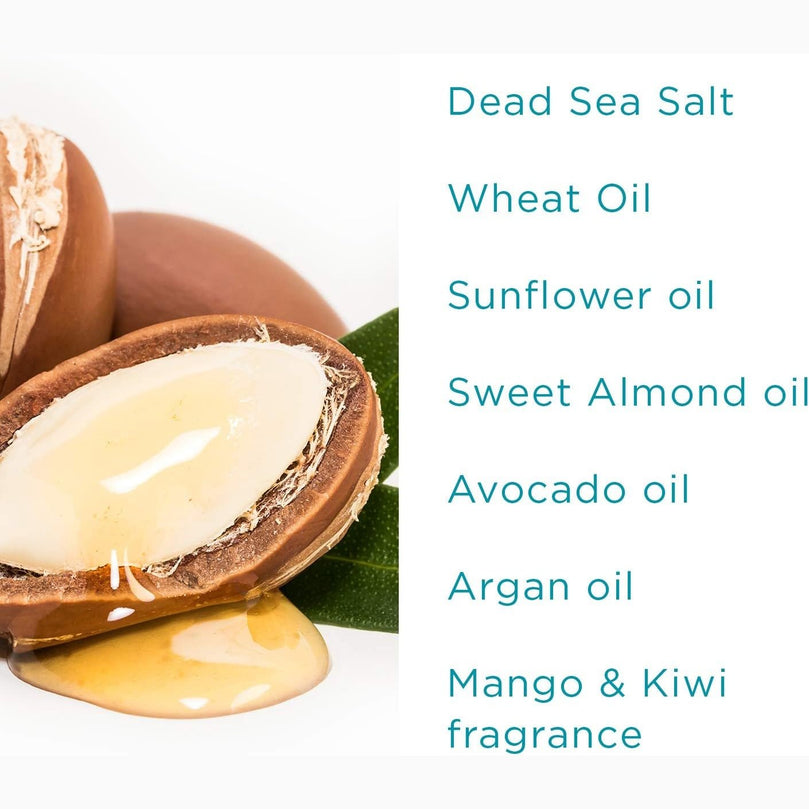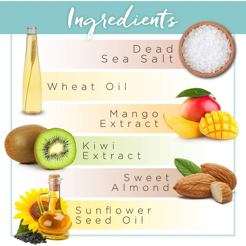Salt scrub blended with natural oils - Powerful dead sea minerals blended harmoniously with sweet almond and wheat oil. The Dead Sea salts combined with oils work at gently exfoliating and removing dead skin cells and revealing a healthy skin glow. The unique body scrub melts and exfoliates, leaving your skin beautiful, soft, and with a sweet and fruity mango and kiwi scent
