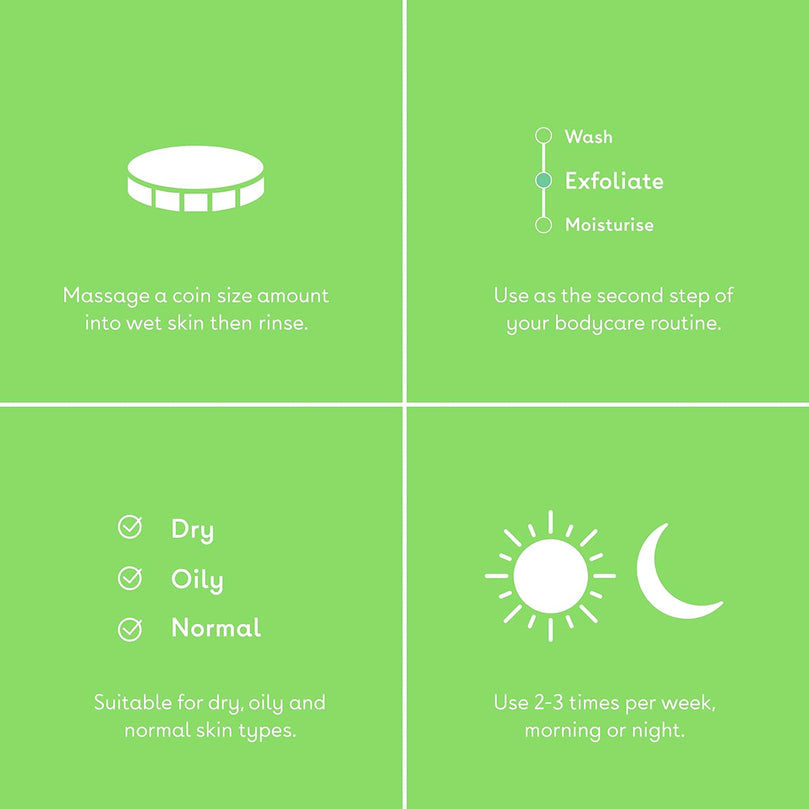 An expert blend of AHA’s Lactic Acid and Glycolic Acid combined with physical exfoliants help to improve skin texture and promote soft and supple skin.