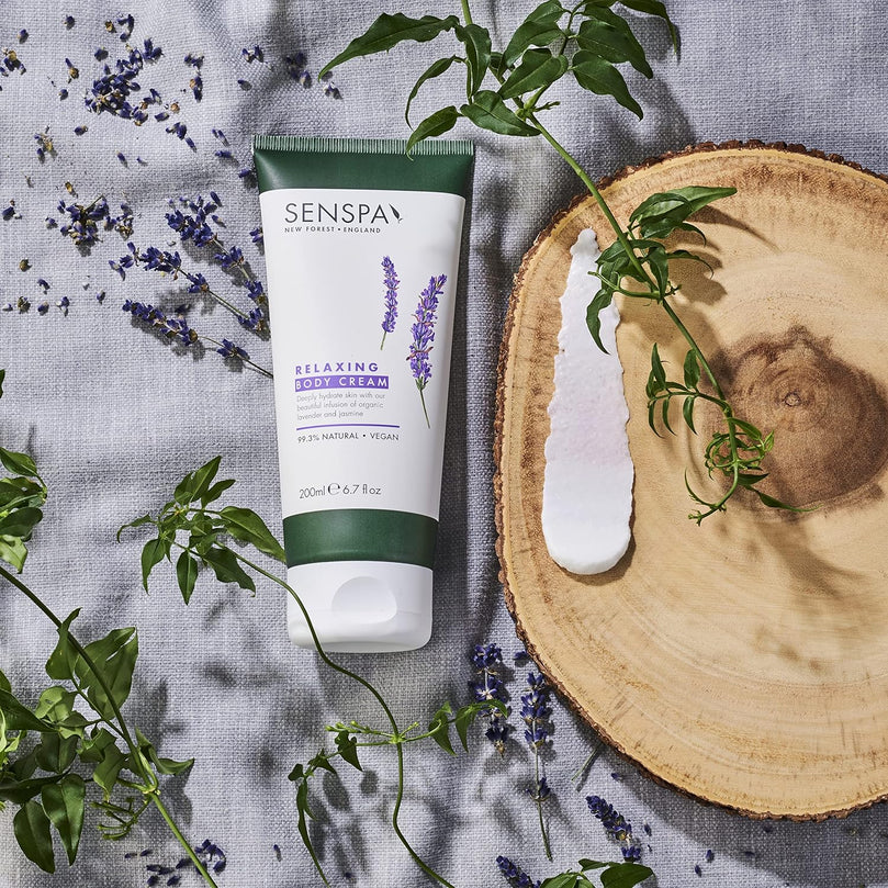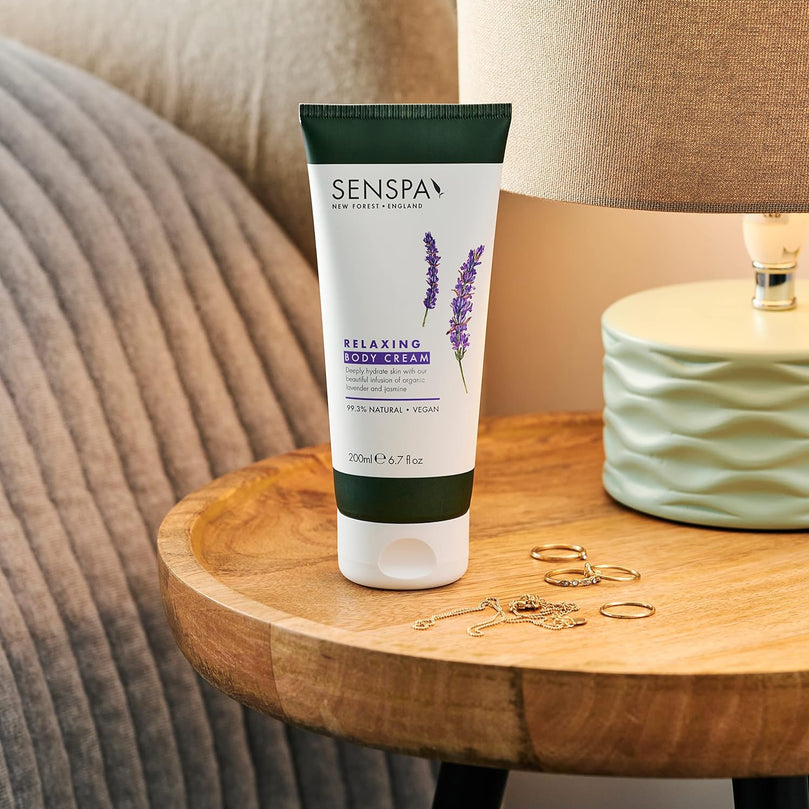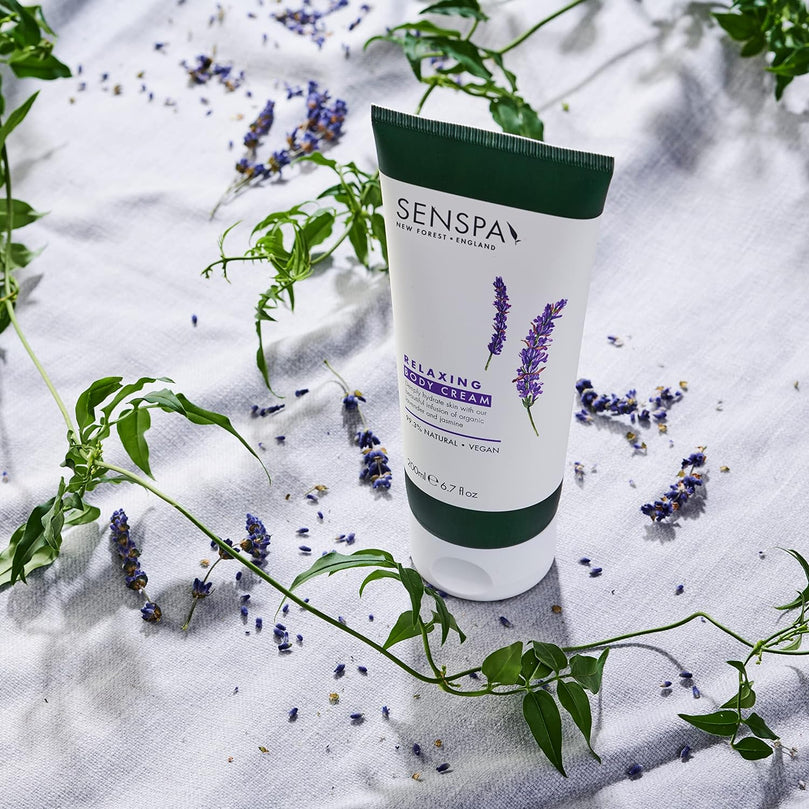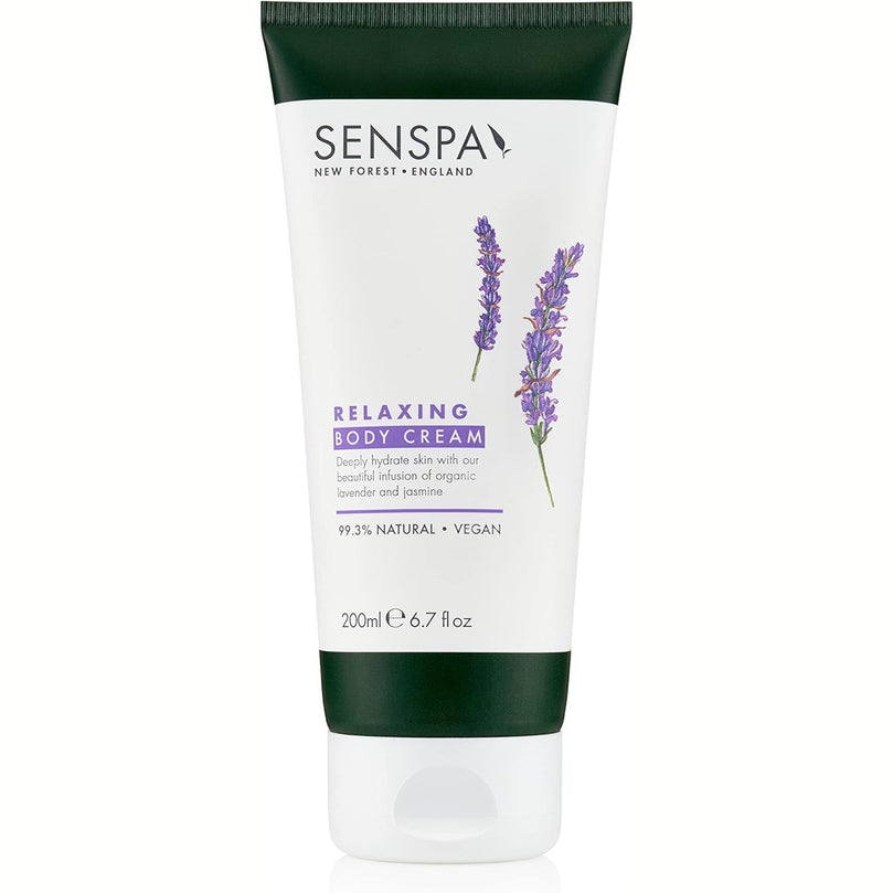 RELAXING BODY CREAM: Unwind with the luxuriously thick Relaxing Body Cream from SenSpa. Deeply hydrate tired, dry skin with a gentle blend of organic lavender and natural ingredients that soften, smooth, and soothe your skin. Available in a 200ml tube.