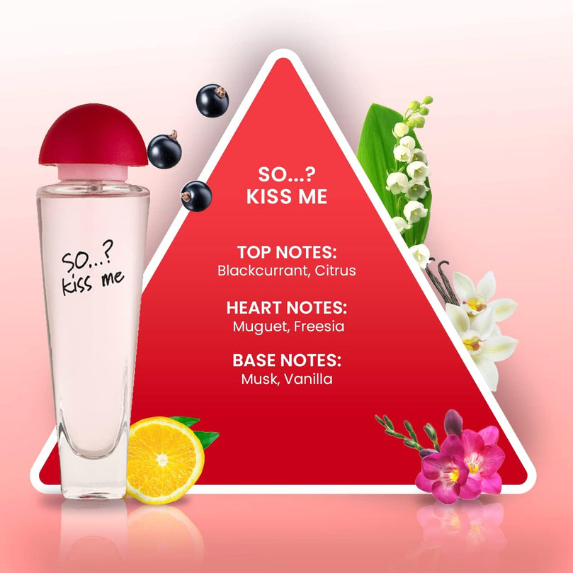 Unlock the captivating fragrance of So...? Kiss Me Women's Eau de Toilette, a luxurious perfume designed to leave a lasting impression. Indulge in the delightful blend of fruity, vanilla, floral, and gourmand notes.
