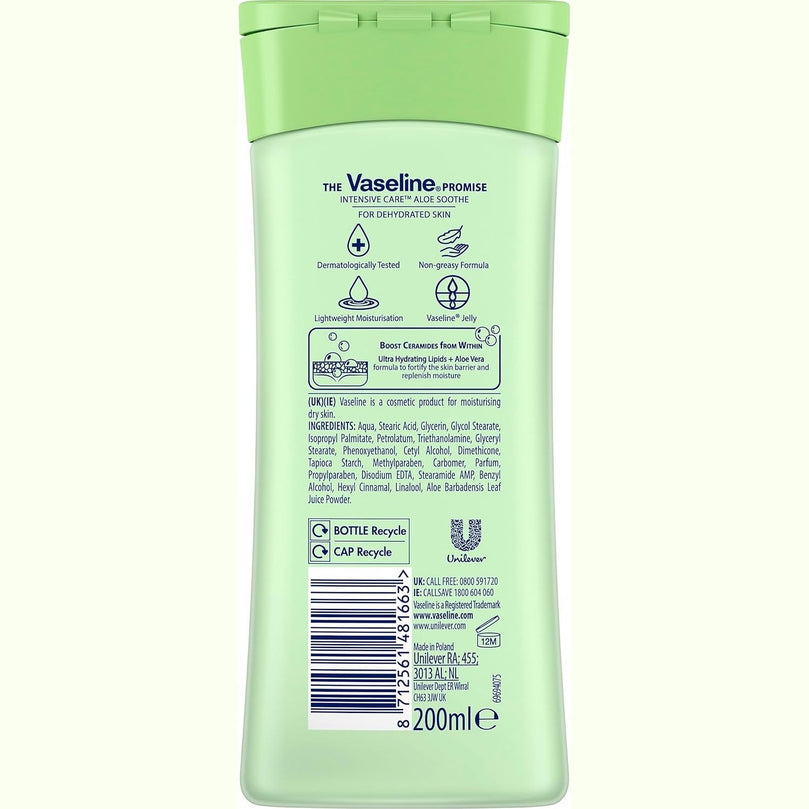 Vaseline cares for the skin you're born in, which is why this body lotion works deep to moisturise dry, rough, and irritated skin. Say hello to soft, smooth, and healthy-looking skin with Vaseline Intensive Care Aloe Soothe body lotion.