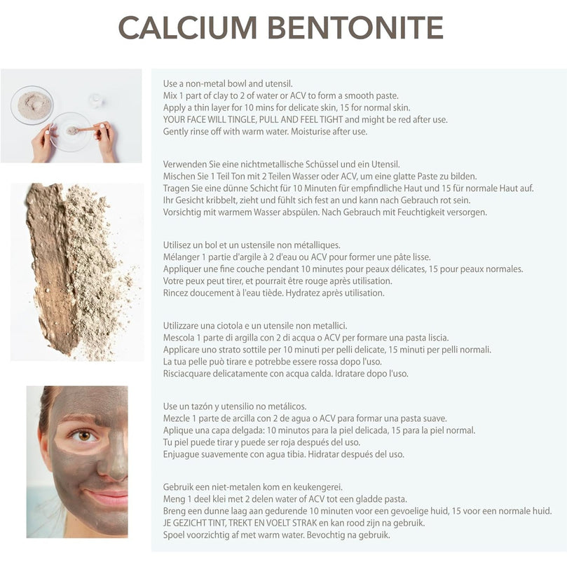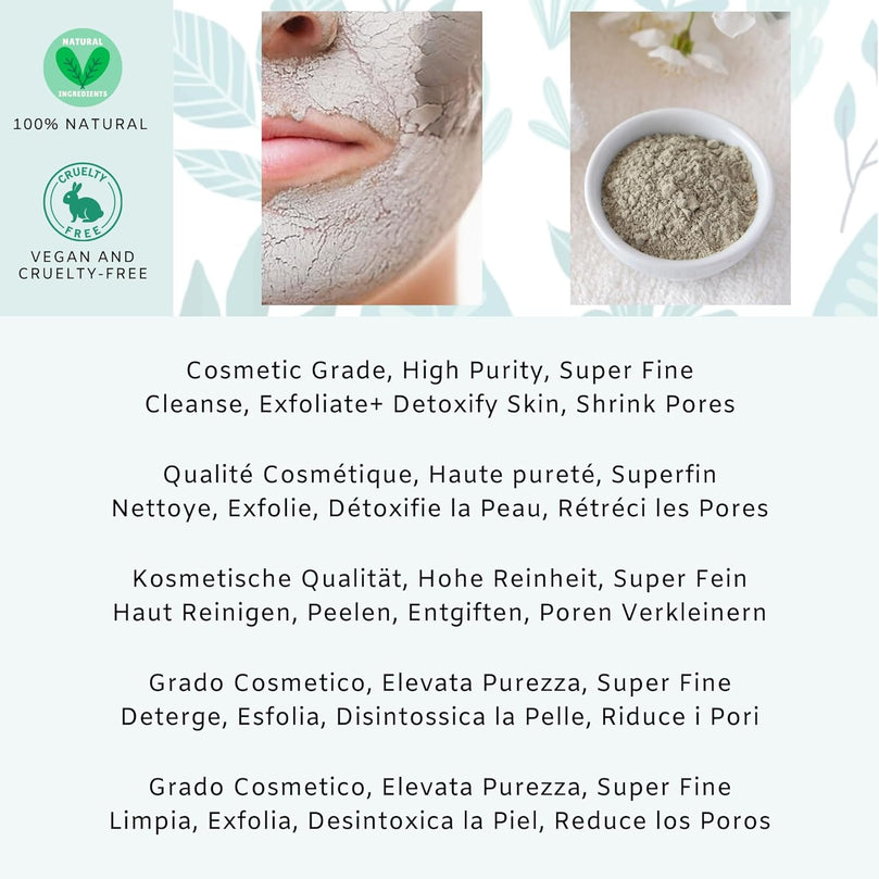 Our superfine, cosmetic grade calcium bentonite clay powder is a powerful detoxifier that bonds with toxins, boosts circulation, and enhances skin tone and health. It is perfect for deep pore skin cleansing, face masks, and detoxifying the skin.