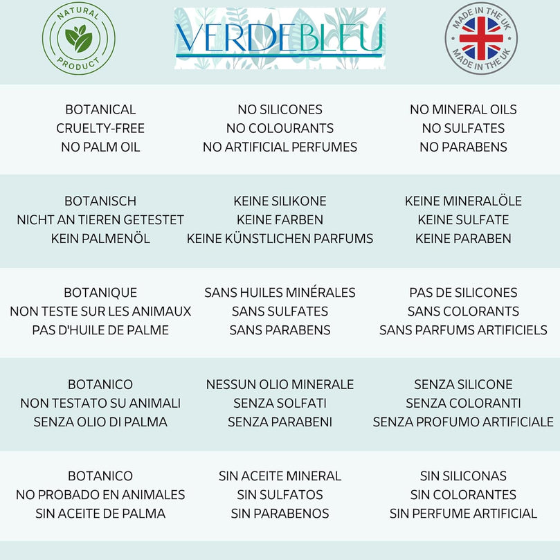 At Verdebleu, we are committed to providing products that are free from harmful chemicals, fillers, sulfates, parabens, animal testing, and artificial colors and fragrances. We also strive to minimize packaging by avoiding boxes and leaflets and using only reusable and recyclable materials. Our product is packaged in a HDPE jar, made from recycled content and is recyclable. The outer packaging is Amazon's shipping requirement and is also recyclable.