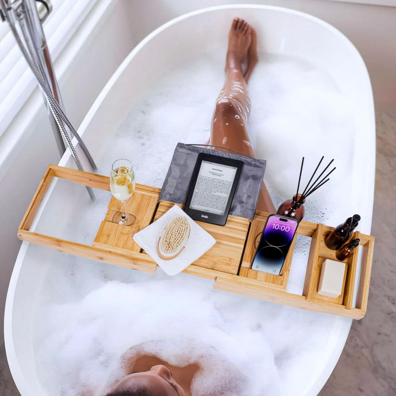 Transform your bath time into a luxurious spa experience with the Woodluv Bath Tray. This multi-purpose bath caddy is designed to fit any size bathtub or spa, making it the perfect addition to your bathroom.
