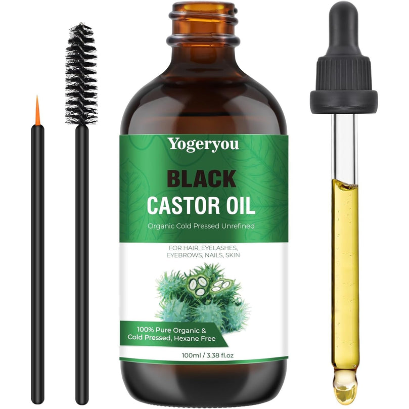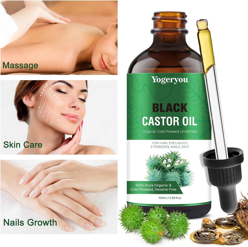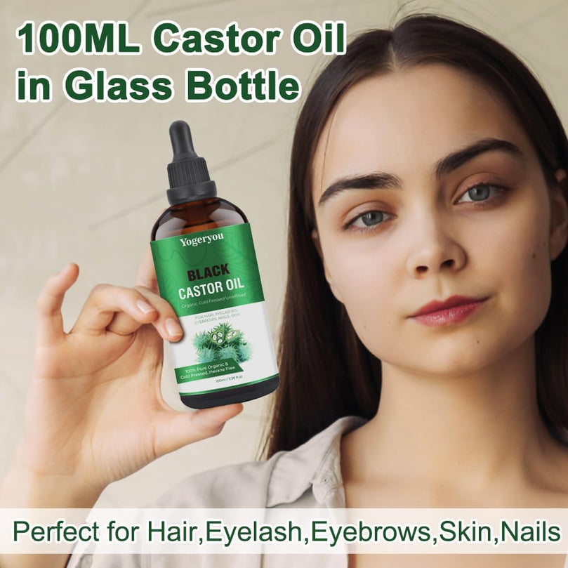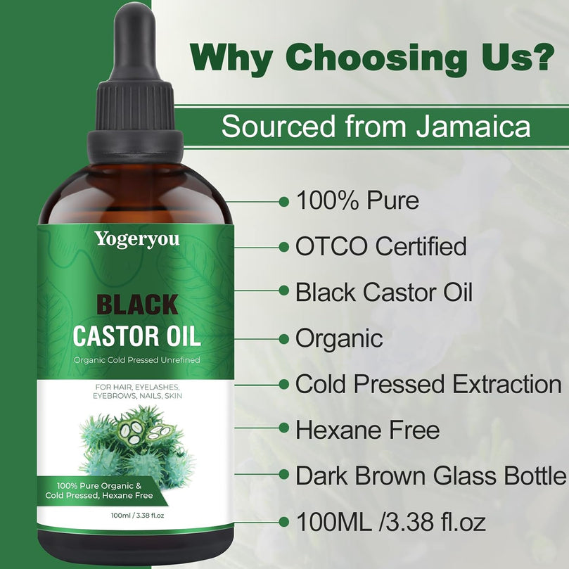 【Deep Moisturizing and Nourishing Skin】Yogeryou thick consistency of black castor oil is a excellent emollient,deeply hydrating the skin and helping to prevent moisture loss.providing dry or rough skin a soft and supple feel.our organic black castor oil contains essential fatty acid and nutrients which will address your minor skin irritations and sooth discomfort and support a radiant complexion.Get one to Discover the transformative power of our 100% Pure Black Castor Oil.